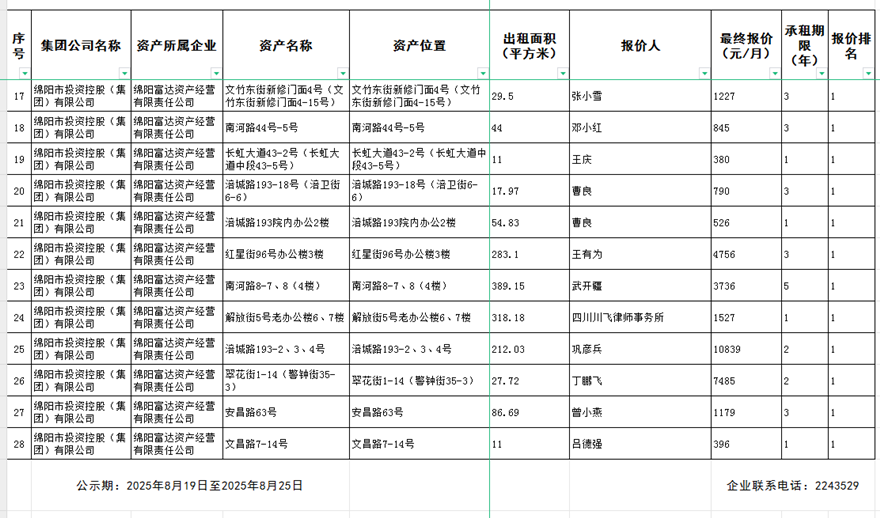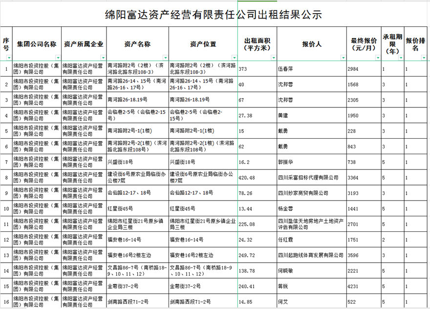 綿陽富達資產(chǎn)經(jīng)營有限責任公司出租結(jié)果公示