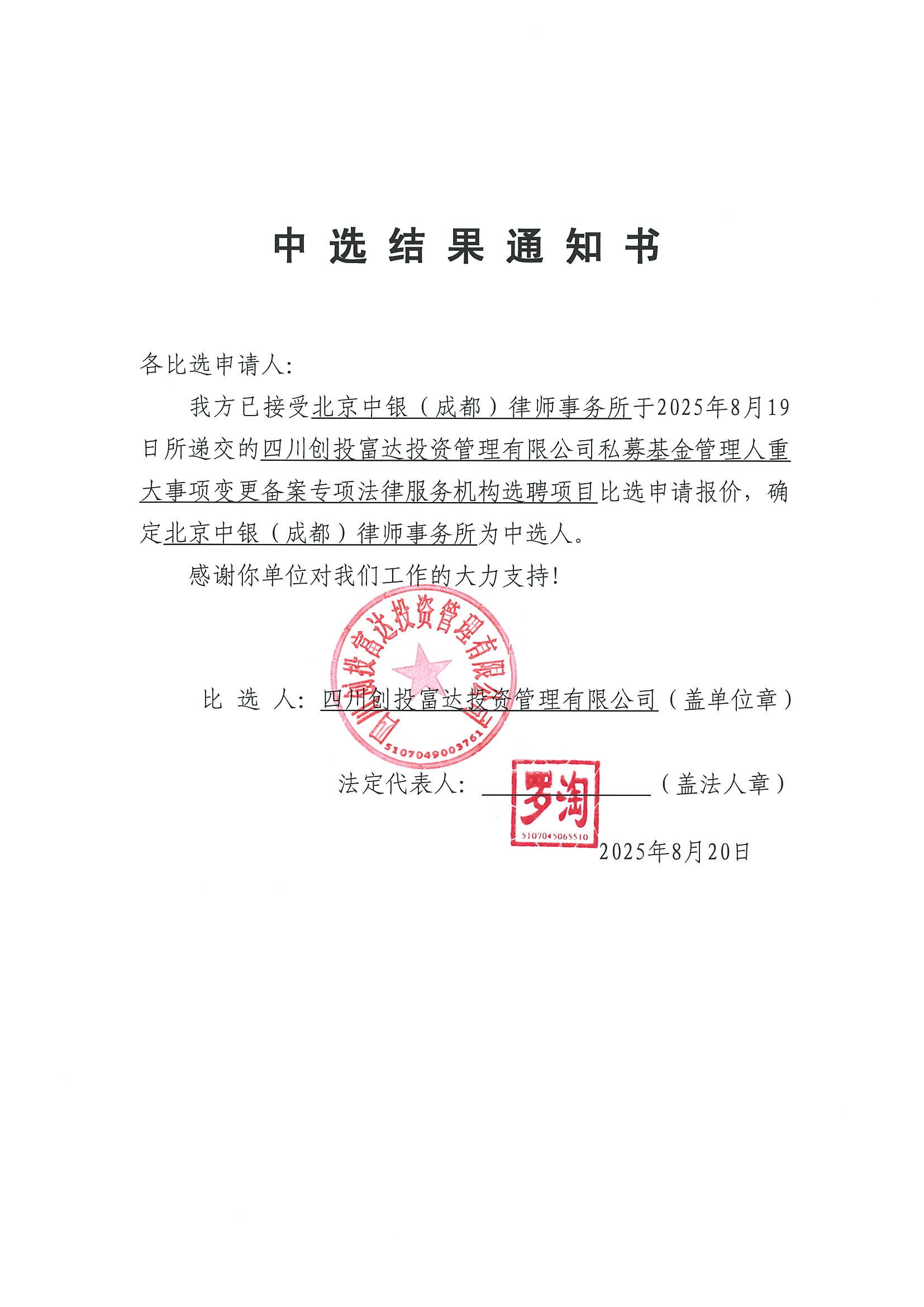 創(chuàng)投富達(dá)私募基金管理人重大事項變更備案專項法律服務(wù)機(jī)構(gòu)選聘中選結(jié)果通知